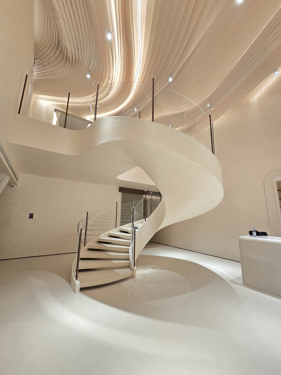 这款高级白色钢结构旋转楼梯,以纯净白色为主色调,搭配透明玻璃栏杆,尽显简约大气与现代质感。