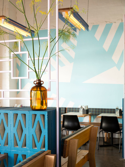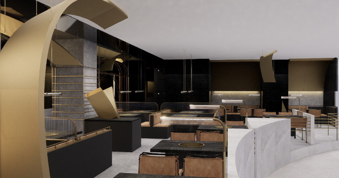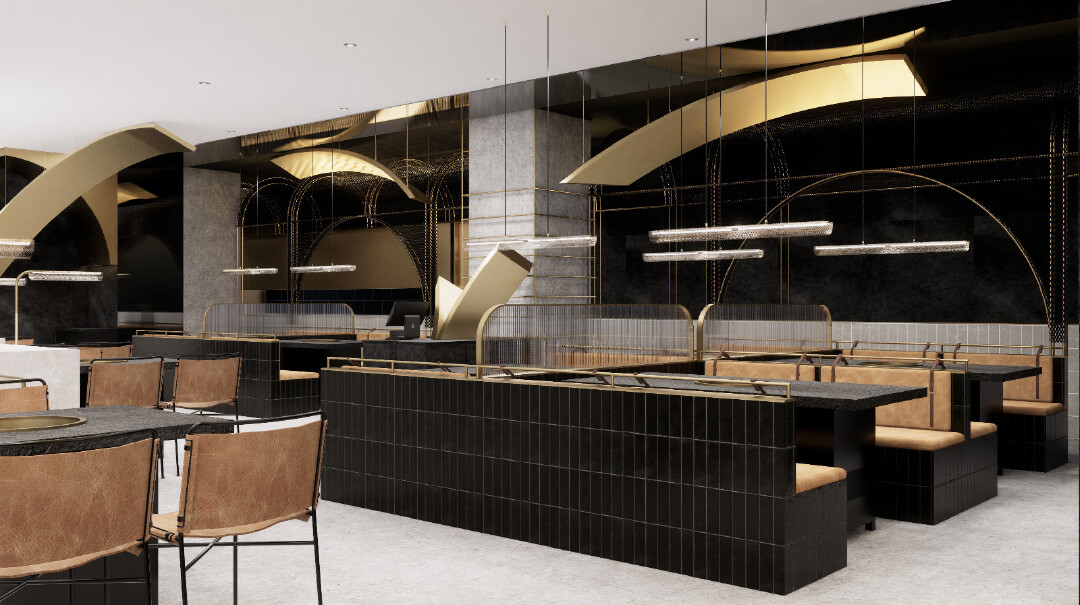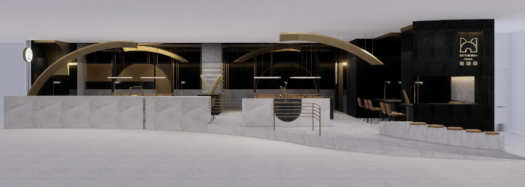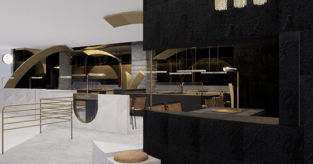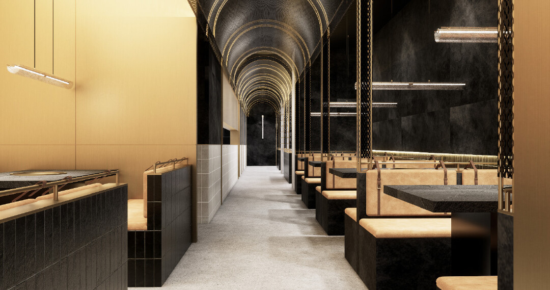 走进这块区域时,会穿过一个拱形造型的走廊,这是吃烤肉前的一丝仪式感,精致纤细的金属管造型构建起强烈的空间特色,金属光泽与朴素黑砖相视,把原始与精炼的矛盾统一发酵,彰显年轻活力与美学品味。