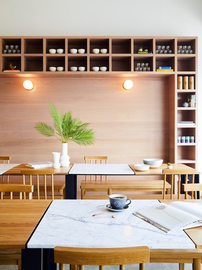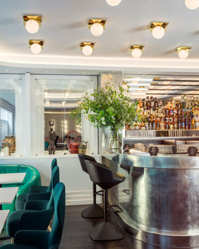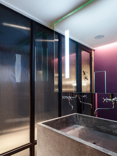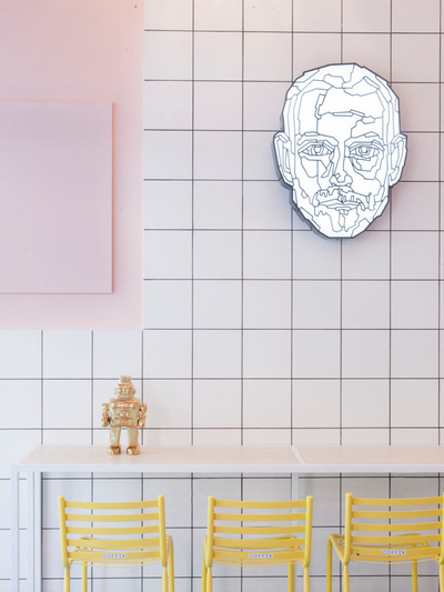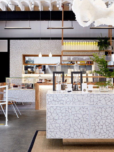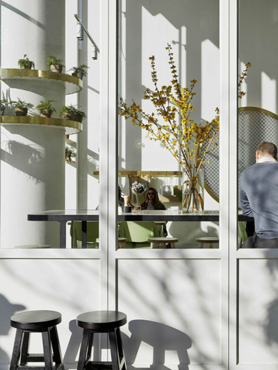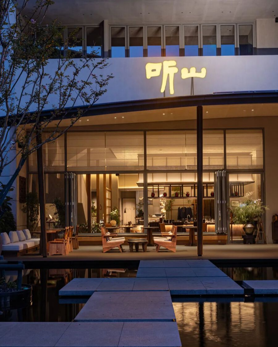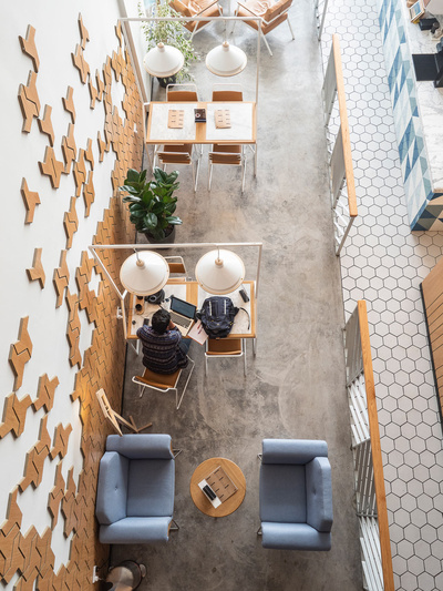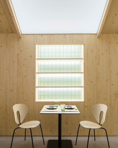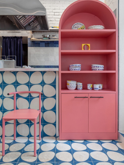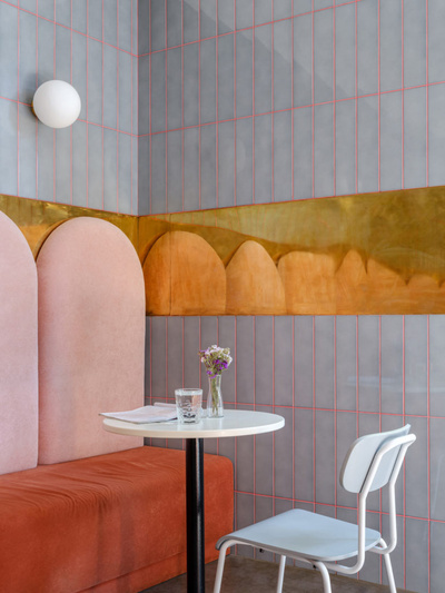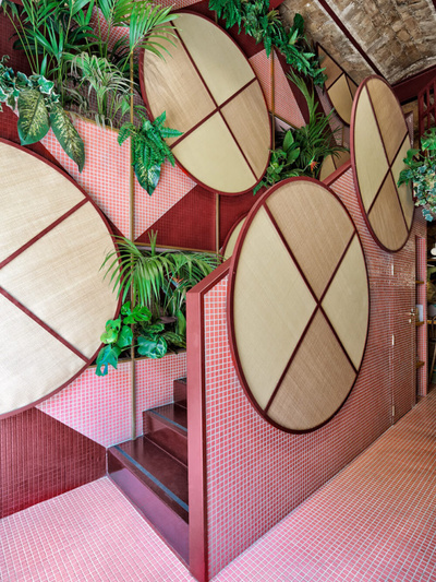 六边形水分子造型的钢网萦绕在天花上,用通透轻盈的质感,浅浅地诉说了水的故事,运用切割的构成方式形成体块化的岛台设计,多趣味、多形态的的调性显著易识,也为取餐动线赋予了灵活性,空间里材料的粗、细对比,色彩深浅对比,器皿陈设的拙、丽对比,预留了充分的展映余地;锈镜、帷幔、纵向规则的条格、异域的吊顶,无不在文化格调上充分彰显小资阶层的审美趣味,清扬雅致下,营造出散淡自由的慢生活情境。自然形成不同的情境空间,统一空间气质下又有微妙的变化,大大丰富了目标客群的多维就餐体验,从所有细节上,消费者会看到空间表情的丰富与生动饱满, 如款型简约且精致的前台、红色的丝绒帷幔、以及六边型纹样窗帘、美食餐饮业道具、自然形态剪影、粗粝的墙和实木、马赛克等每个细节都值得玩味。
