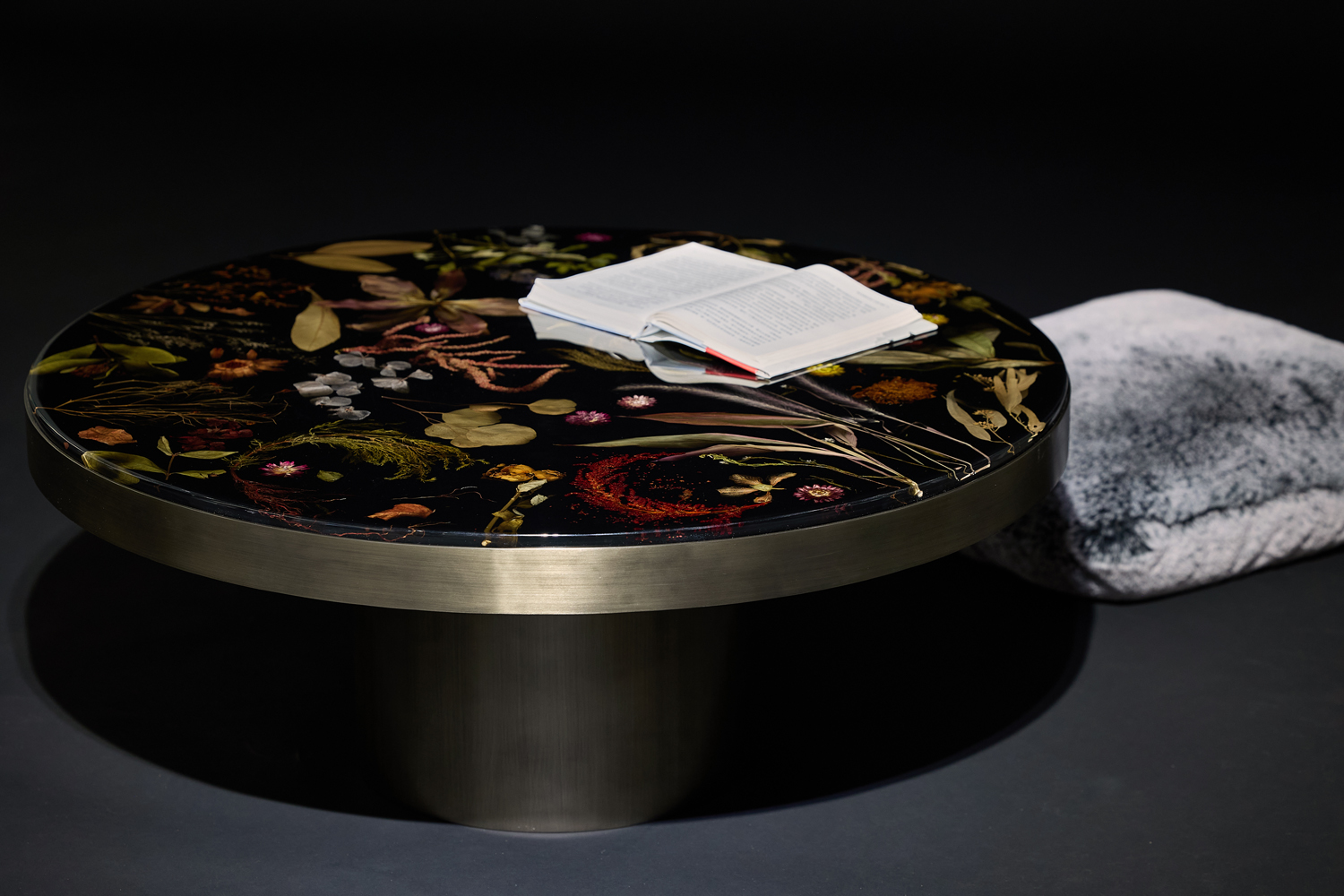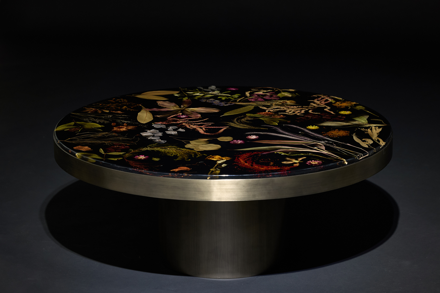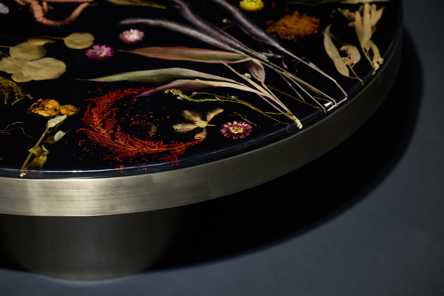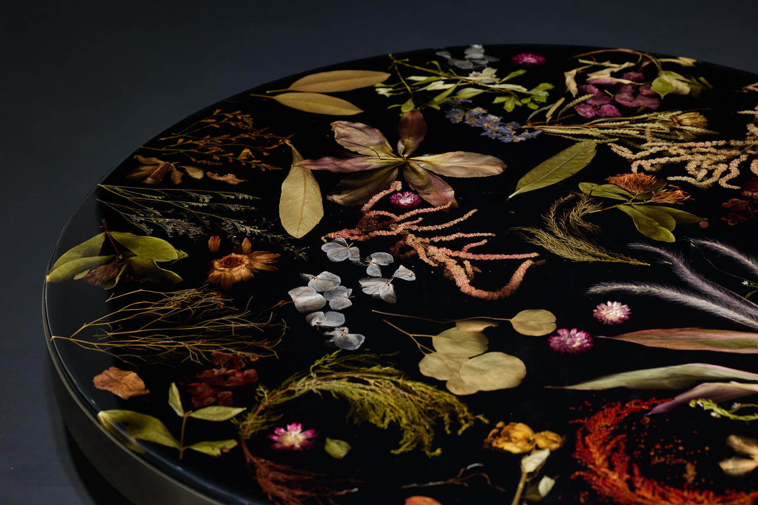 花板圆几: 以水晶亚克力封存真花标本,搭配金属底座与边框,于客厅作茶几,让自然诗意融入日常;放书房当边桌,每朵花植都是灵感触点,把四季烂漫定格在空间里。