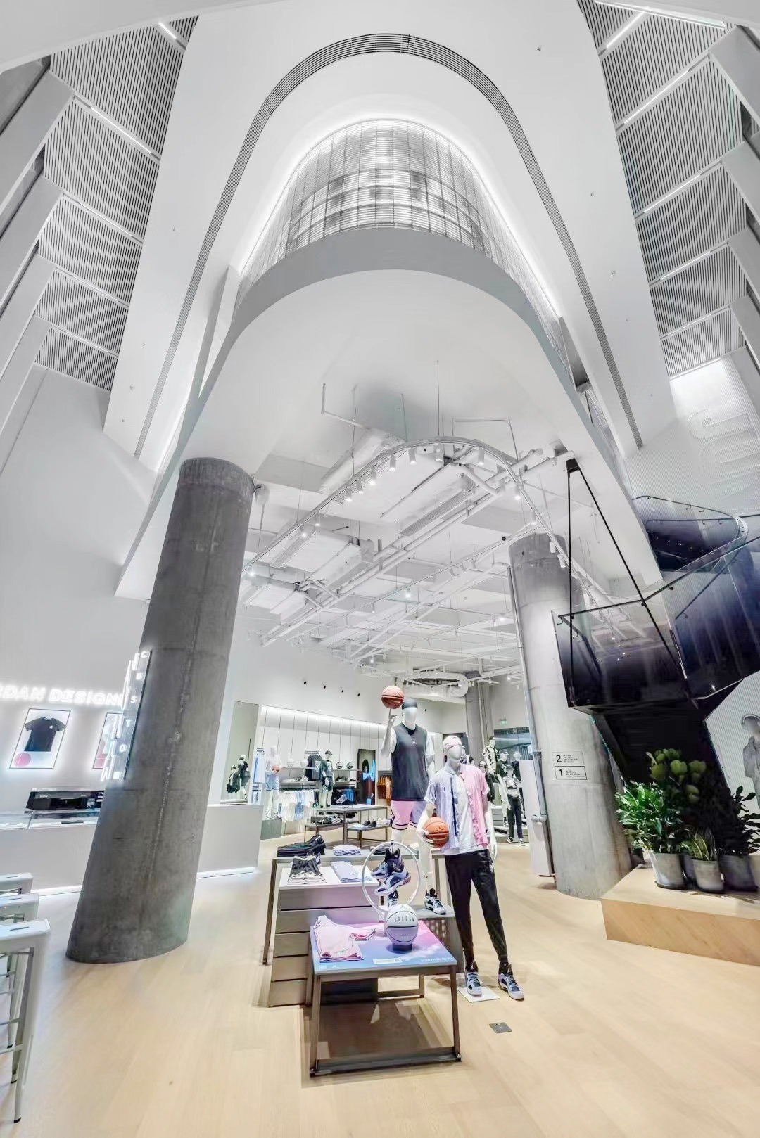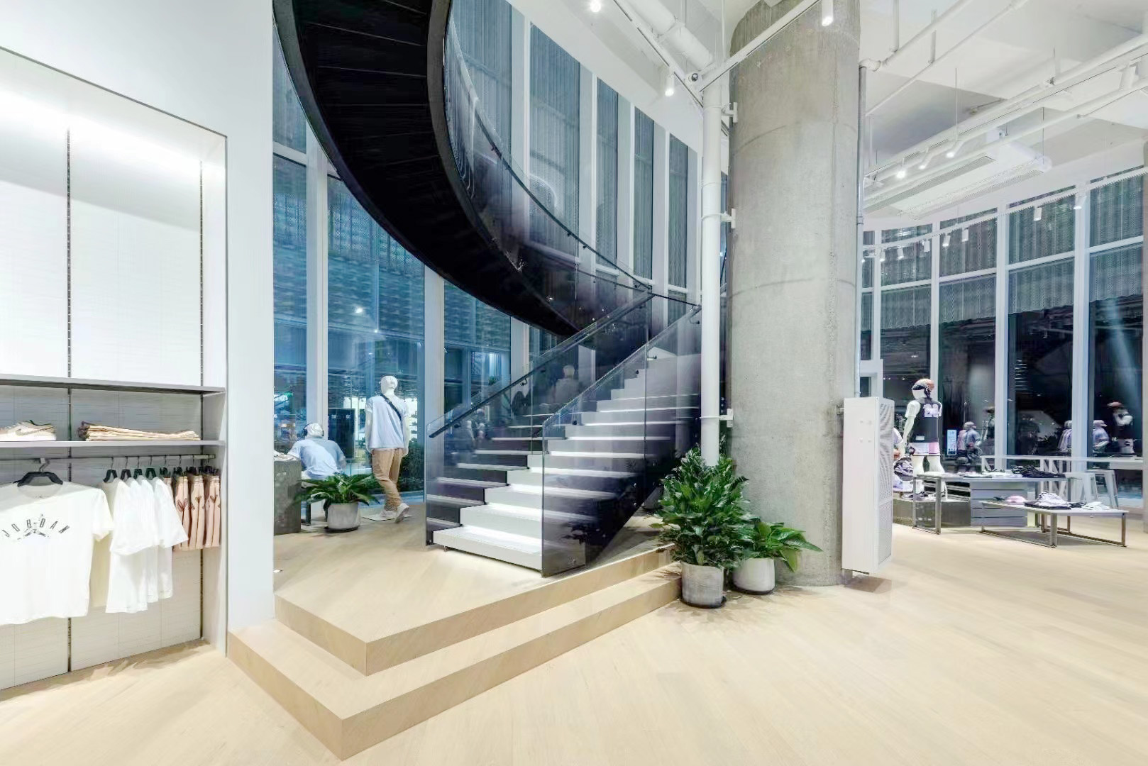钢结构材质使其具备坚固耐用的特性,同时也能更好地塑造这种富有艺术感弧形形态,搭配通透玻璃栏杆简约时尚