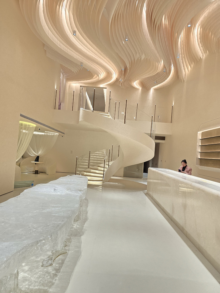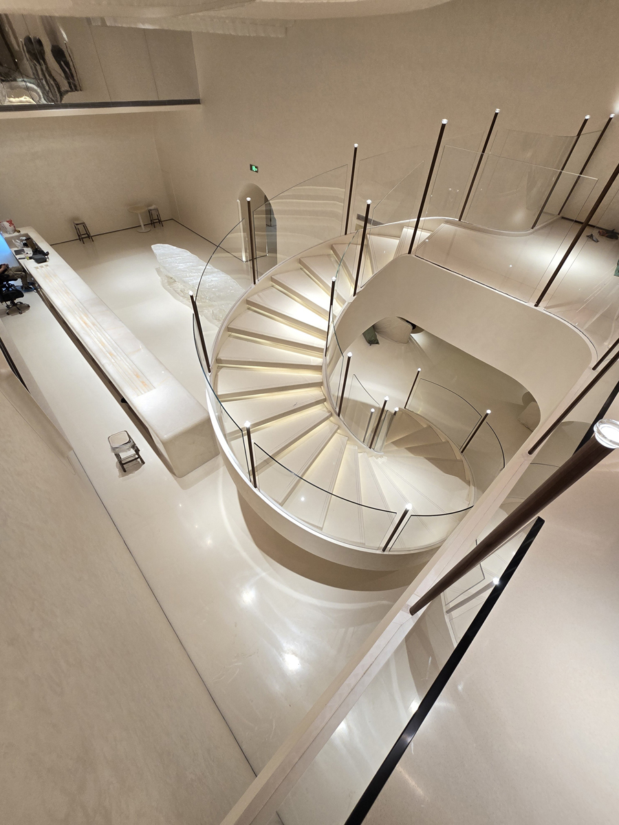 这款高级白色钢结构旋转楼梯,以纯净白色为主色调,搭配透明玻璃栏杆,尽显简约大气与现代质感。